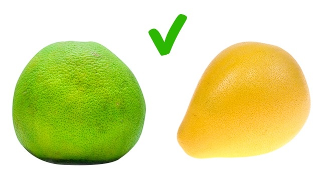 - Колір помело може бути жовтим, зеленим та оранжевим залежно від сорту. Нерівномірне забарвлення шкірки говорить про те, що при вирощуванні цитруса використовували хімікати, а ось про стиглості помело по ній судити не можна.