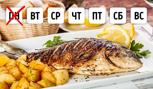 За словами Ентоні Бурда, більшість ресторанів купують рибу напередодні вихідних — по четвергах або п'ятницях. У вихідні рибні ринки зазвичай закриті, а свіжої риба може залишатися лише 3 дні. Тому в понеділок вам доведеться або скуштувати рибу не першої свіжості, або задовольнятися замороженою.