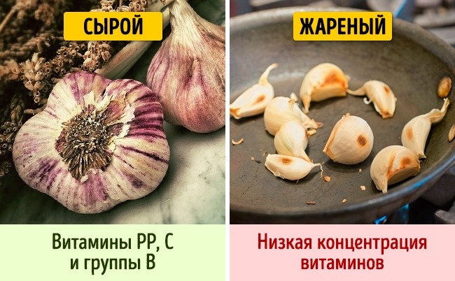 Сирий часник багатий вітамінами С, PP і групи B, а також є джерелом холіну. Але термічна обробка позбавляє цей продуктчастині корисних властивостей.
