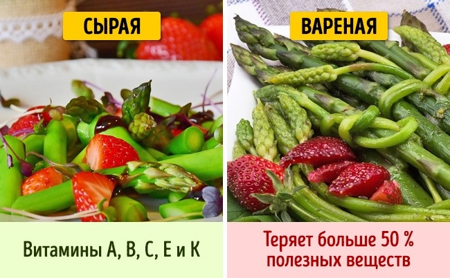 Спаржа — незамінне джерело вітамінів А, С, Е, K, групи В, а також фолієвої кислоти. Але обсмажування позбавляє цей овоч більшості корисних властивостей.