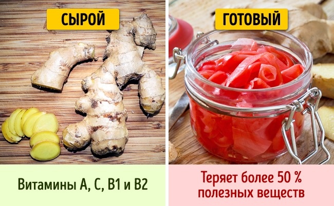 Сирий імбир дуже гострий, зате є джерелом вітамінів А, C, B1, B2, а також ряду важливих мікроелементів. Під час термічної обробки більша частина корисних речовин пропадає.