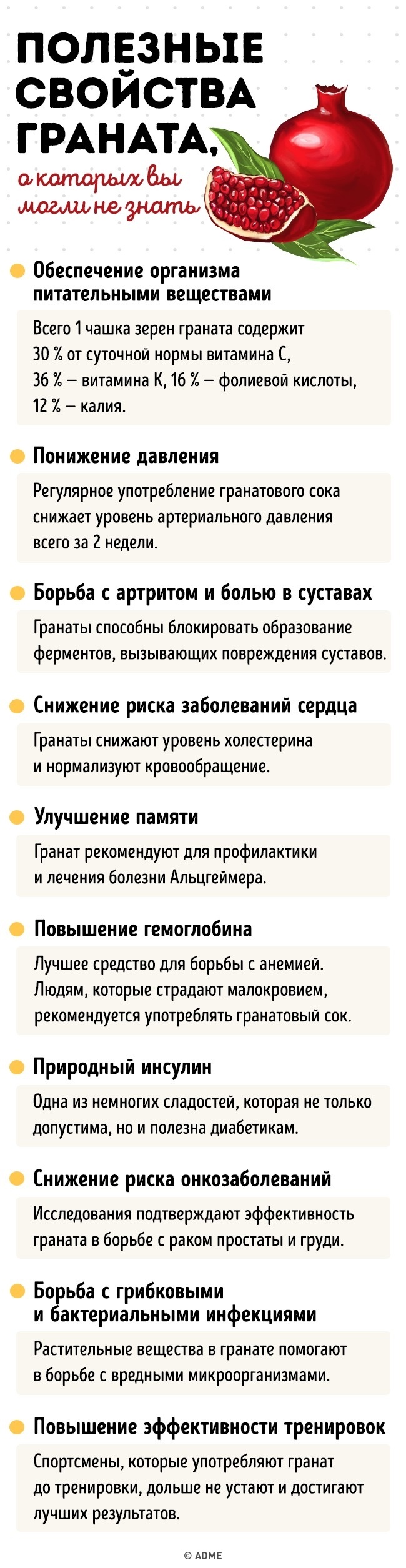 Гранат — не тільки смачний, але і дуже корисний фрукт. Він може надати неоціненну допомогу в боротьбі з багатьма захворюваннями, поліпшити самопочуття і просто підняти настрій.