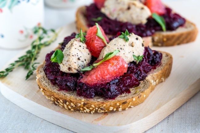 Грейпфрут обробити на чисте сегменти, зберіть сік. Відварну буряк натріть на дрібній тертці, заправте соком грейпфрута, сіллю, рослинним маслом і збийте виделкою. Змастіть скибочки цільнозернового хліба пастою з буряка, покладіть дві кнелі з риета з скумбрії з чорносливом і 2 скибочки грейпфрута. Посипте крупномолотим чорним перцем і насолоджуйтеся незвичайним смаком.