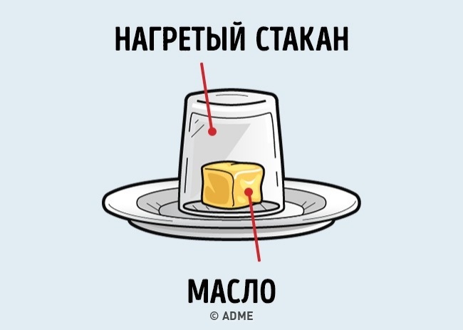 - Якщо вам терміново потрібно м'яке вершкове масло (для бутербродів), а ви тільки що вийняли його з морозилки, є наступний рецепт: поставте склянку з водою в мікрохвильовку, погрійте його. Вилийте воду, накрийте теплою склянкою масло і через пару хвилин воно стане м'яким.