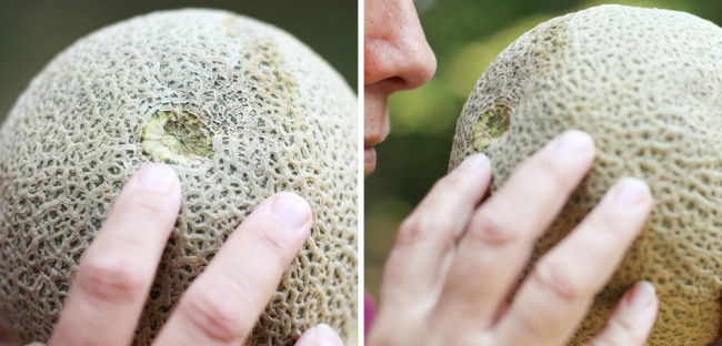 В першу чергу диню потрібно понюхати. Стиглий плід завжди пахне динею, а не травою. Зовні вона пружна, без видимих пошкоджень і плям. Якщо натиснути пальцем на шкіру, то на стиглої дині з'явиться вм'ятина, яка тут же зникне. На зеленій дині вона не з'явиться, а на переспілої не зникне після того, як палець прибраний.