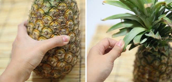 Стиглий ананас буде пружним, без вм'ятин і тріщин, але при цьому не м'яким. Якщо плід м'який, то його зірвали зеленим і довго зберігали. Якщо натиснути на фрукт, то під пальцями він прогнеться, але отпружинит назад. Підстава свіжого і стиглого фрукта буде завжди вологе, не сухе.