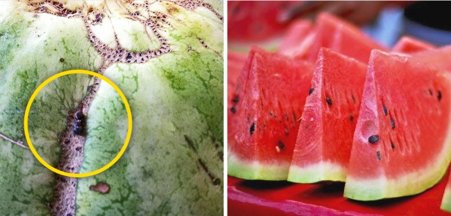 У стиглого кавуна хвостик завжди сухий і жовтуватий, шкірка блискуча, без нальоту і пошкоджень. На тій стороні, де кавун лежав на баштані, — пляма. Якщо воно жовте або оранжеве — плід дозрів.