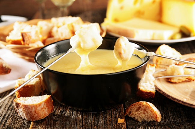 - Переставляємо фондю на пальник, де воно повинно постійно кипіти, і макаємо в сирний соус кубики хліба або шматочки свіжих овочів, нанизані на палички або довгі вилки. М-М-м, смакота!