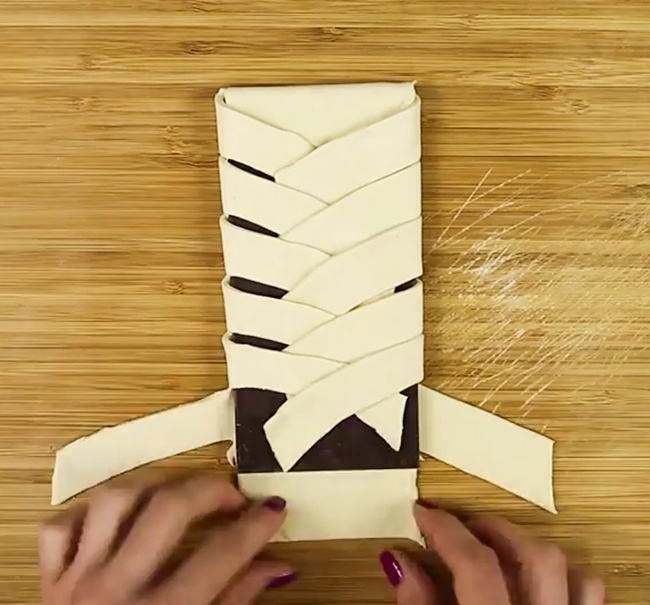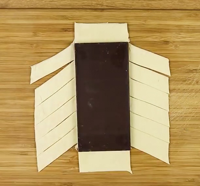 - Загорніть плитку в тісто, починаючи з квадратних частин зверху і знизу.