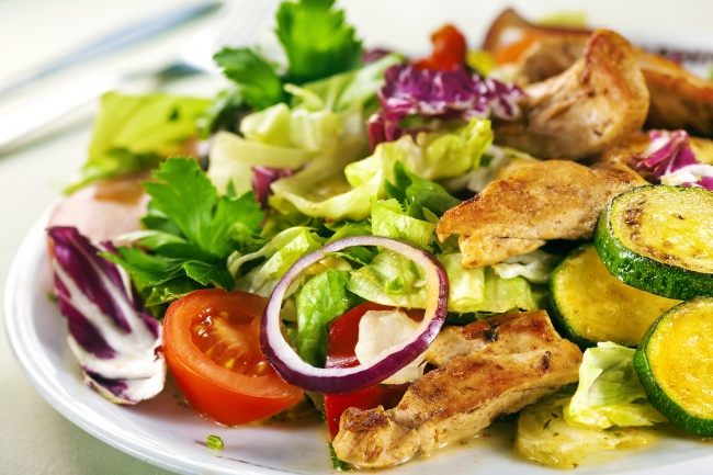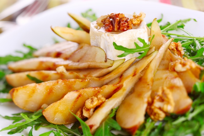 - Готові овочі викласти на тарілку. Туди ж додати рукколу і нарізану моцарелу.