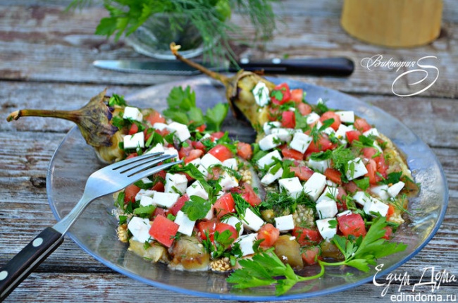 - На баклажани викласти часник, помідори, рубану зелень і нарізаний кубиками сир фета. Замість фети можна використовувати бринзу або адигейський сир, також ви можете не нарізати кубиками, а покришити поверх помідорів.