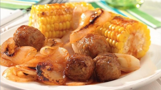 - Викладіть на кожен лист фольги по 4 м'ясних кульки, 2 кільця цибулі, 2 качана кукурудзи і 1/2 чашки картоплі. Посоліть і поперчіть. Зверху додайте по 2 ч. л. соусу.