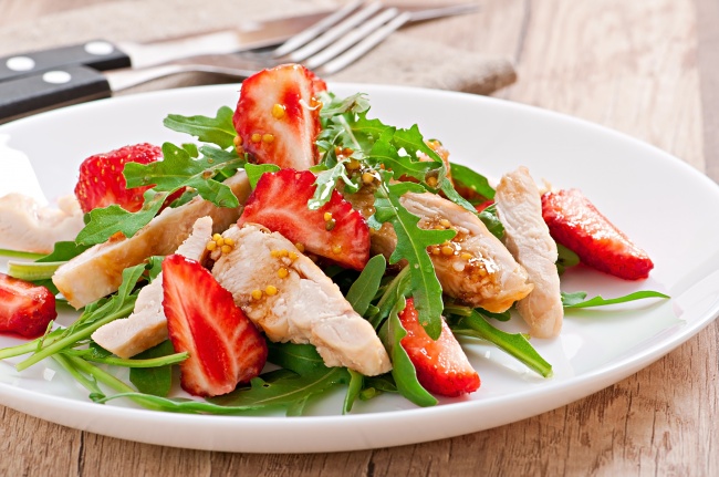 - На рукколу з полуницею викласти шматочки курки і камамбер.
