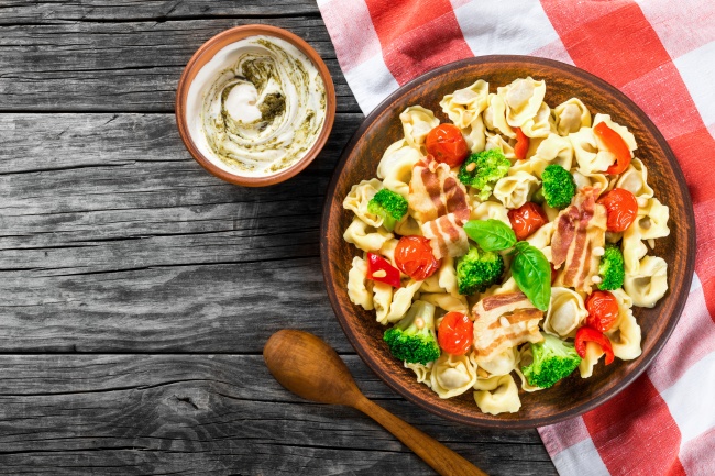 - Остиглу пасту складіть у салатник, додайте до неї овочі, заправку і акуратно перемішайте.