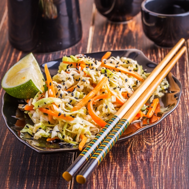 - Додайте масло, соєвий соус і перемішайте. Влити заправку в салат, перемішайте, дайте постояти близько 30 хвилин в прохолодному місці. Зверху посипте кунжутом.