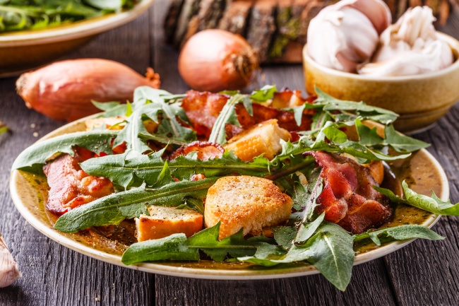 - Бекон наріжте, обсмажте у власному соку і викладіть на листя кульбаби і щавлю.