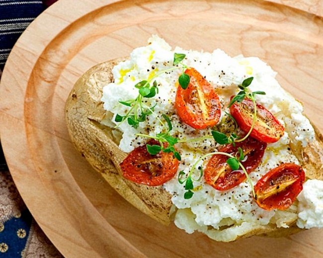 - Розкриваємо картоплю (можна навпіл, можна хрест-навхрест). Зверху кладемо сир рікотта, смажені помідори. Можна зверху посипати свіжої рубаною зеленню.