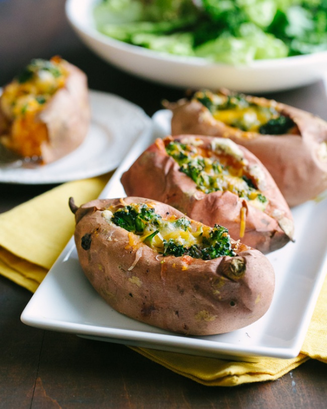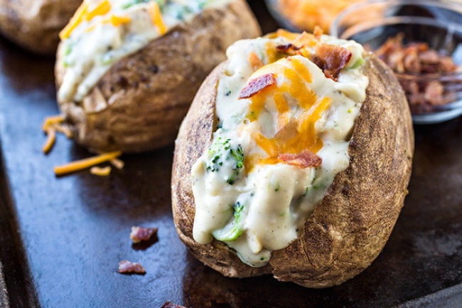 - Коли картопля пропечеться, акуратно видаляємо більшу частину м'якоті. У кожну картоплину додаємо квасоляний суміш, а зверху — суцвіття брокколі сирної суміші. Кладемо картоплю в духовку на кілька хвилин, поки сир не розплавиться. Подавати картоплю теплим.