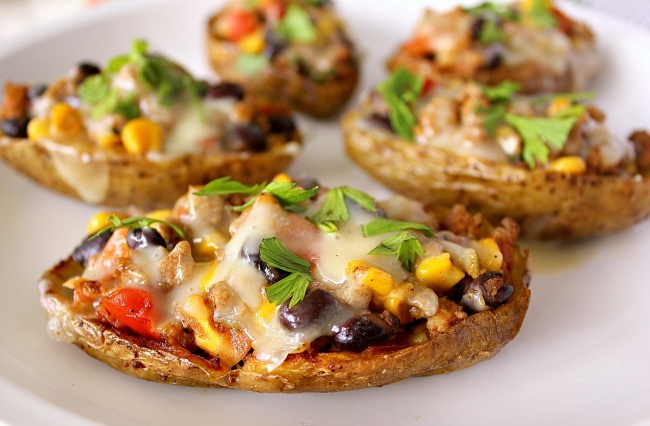 - Нарешті виймаємо шкурки з духовки і відразу наповнюємо їх м'ясною начинкою. Зверху посипаємо тертим сиром і засовуємо назад в духовку. Чекаємо, коли розплавиться сир. Перед подачею на стіл фарширований картопля посипаємо нарізаною кінзою.