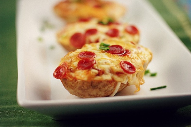 - Викласти в човники з картоплі начинку, викласти його на змащений оливковим маслом деко, запекти в розігрітій до 200 градусів духовці 10 хвилин.