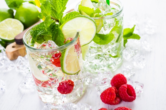1 лайм нарізаємо скибочками або кружальцями, додаємо в посуд півсклянки малини. Заливаємо водою.
