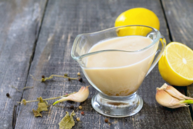 - Добре збити блендером до білого кольору. Посолити, додати сік лимона і трохи холодної води. Соус повинен вийти досить густим — як майонез.