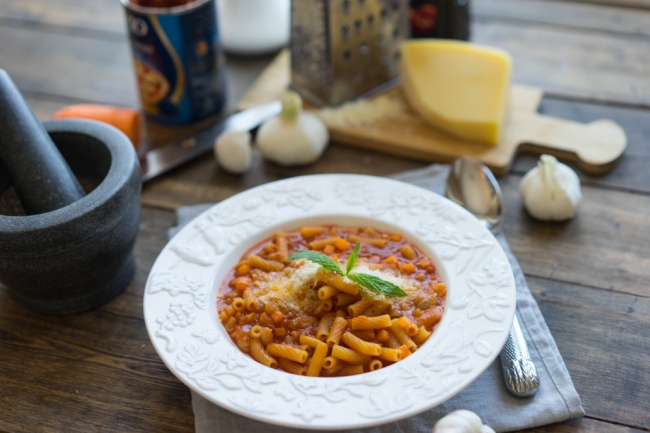 - Додати квасолю, обсмажити 2 хвилини. Потім додати томати, перемішати і влити бульйон. Всипати пасту і варити до стану «аль денте».