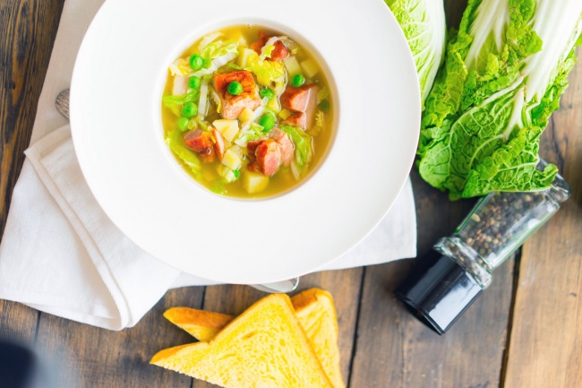 - Нарізати пекінську капусту смужками. Коли картопля буде повністю готовий, додати капусту та горошок, поварити пару хвилин і зняти з вогню.