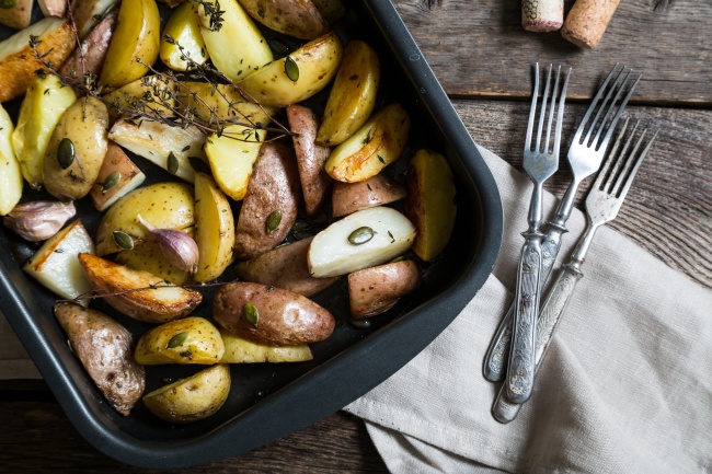 - Викласти картоплю на тарілку і змішати з рештою оцтом. Перед подачею посипати часником, сіллю і зеленню.
