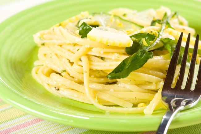 - У мисці змішуємо вершки, оливкове масло і жовтки. Додаємо цедру і нашатковану базилік. Солимо і перчимо.