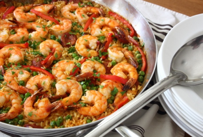 - Додаємо до рису зелений горошок і креветки, солимо і перчимо за смаком. Накриваємо кришкою і готуємо ще 5 хвилин до м'якості рису.
