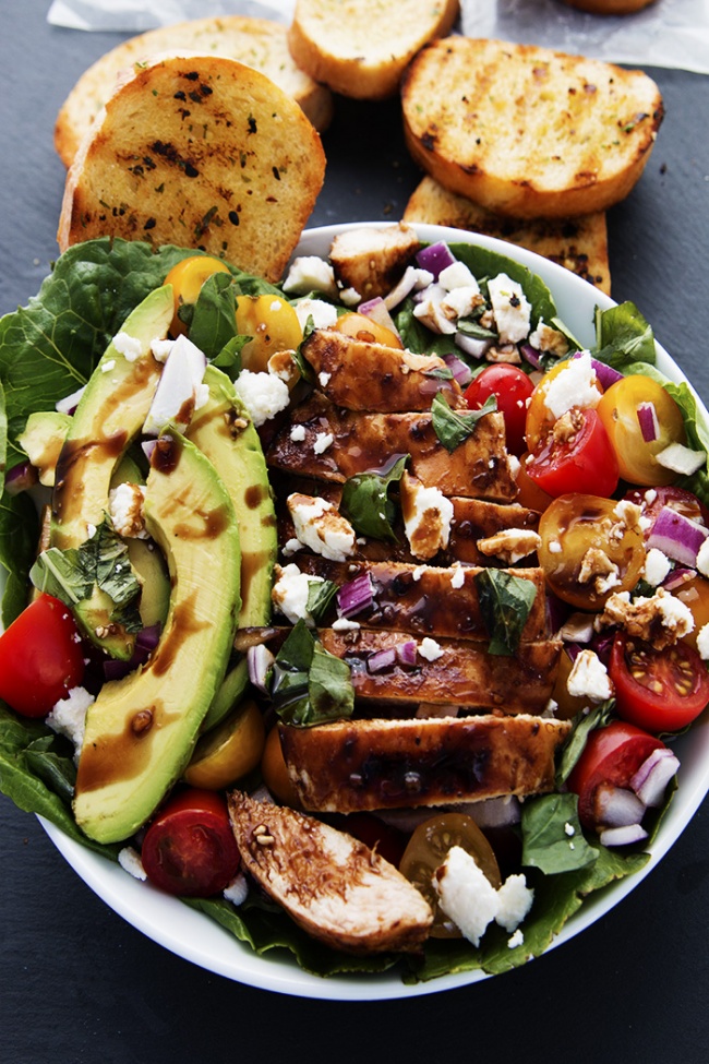 - Зверху салату викладаємо курку. Поруч кладемо брускетта.