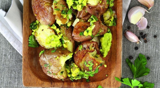 - Вийміть картоплю з духовки і посипте дрібно нарізаною петрушкою і свіжомеленим перцем. Полийте соусом з авокадо і відразу ж подавайте до столу.
