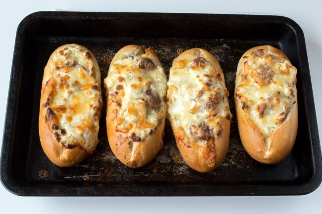 - Покласти готові гриби на дно булочки, зверху часточку томату, посипати тертим сиром.