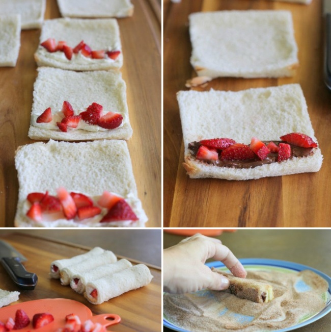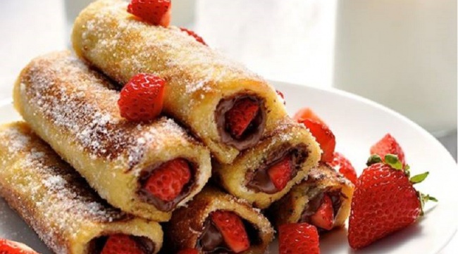 Зріжте скориночки з хліба і трохи розкачайте качалкою кожен шматочок. Змастіть тости шоколадною пастою і доповніть улюбленими фруктами. Потім скачайте шматочок хліба трубочкою, умочіть в яєчно-молочної суміші, обсмажте до золотистої скоринки і присипте цукровою пудрою.