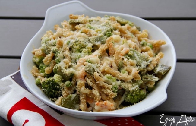 Запечена паста з креветками, зеленими овочами і ароматним сиром