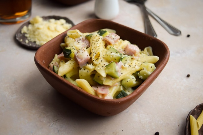 - Подаємо пасту, заливши її сирним соусом з кабачками і шинкою. Приємного апетиту!