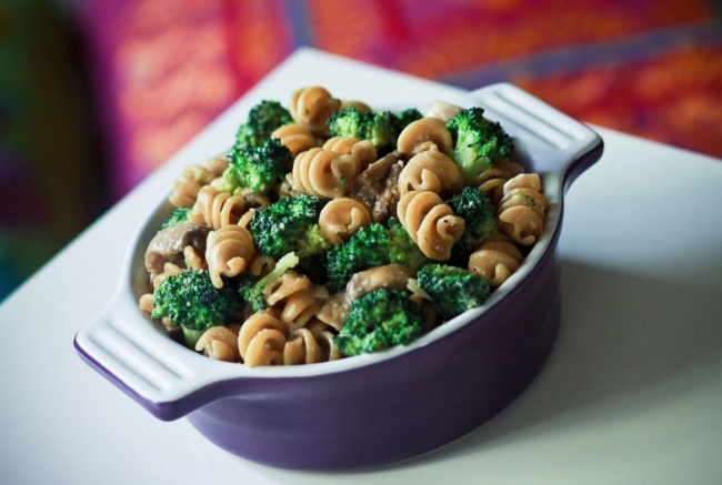 - Готуємо пасту відповідно до вказівок на упаковці і за кілька хвилин до кінця варіння додаємо брокколі. Потім зливаємо воду і повертаємо пасту і брокколі назад в каструлю.