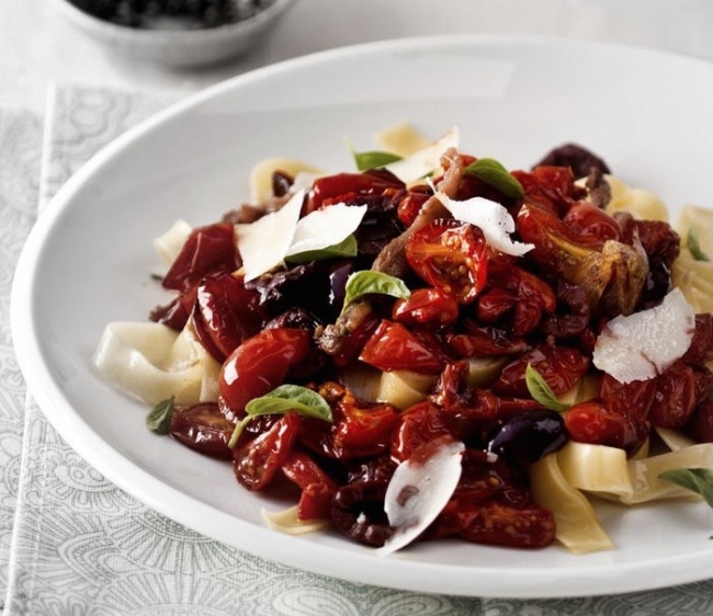 - Коли помідори будуть готові, додаємо оливки, каперси і анчоуси, поливаємо бальзамічним оцтом. Солимо і перчимо. За необхідності додаємо ще трохи оливкової олії. Прогріваємо в духовці перед подачею на стіл.