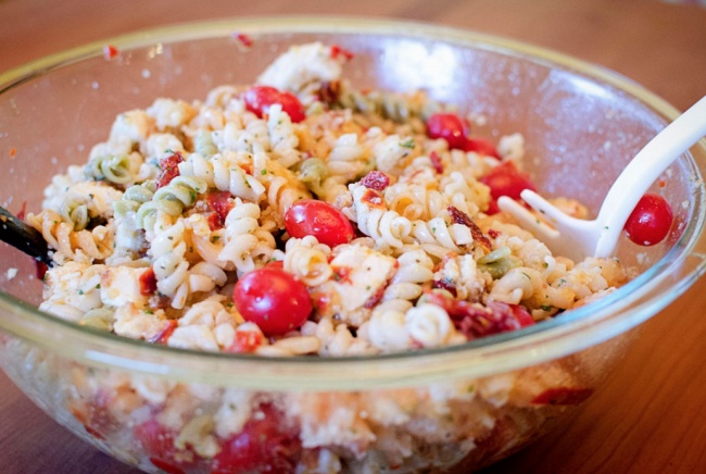 - Перекладаємо пасту простору в салатницю. Додаємо м'який сир і добре перемішуємо. Потім овочі, лимонний сік, цедру і креветки і ще раз все перемішуємо.