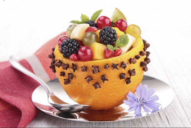 Беремо грейпфрут, зрізаємо верхівку, виймаємо м'якоть. М'якоть очищаємо, ріжемо на невеликі шматочки. Так само ріжемо будь-які наявні в будинку фрукти: яблука, виноград, банани. Всередину кошики кладемо на вибір збиті вершки, розтоплений на невеликому вогні молочний шоколад, кулька морозива або солодкий сир.