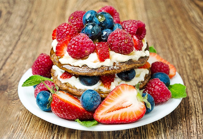 Змішуємо ложкою маскарпоне з цукром за смаком. Викладаємо перший панкейк, на нього — крем. Зверху ще один панкейк, на нього — крем. Прикрашаємо ягодами, фруктами за власним смаком. Можна полити вийшло тістечко медом.