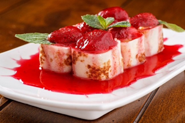 Звертаємо лаваш з начинкою в акуратну ковбаску, даємо трохи просочитися. Ріжемо на шматочки. Прикрашаємо за бажанням збитими вершками, ягодами і сиропом. Подаємо з кавою.