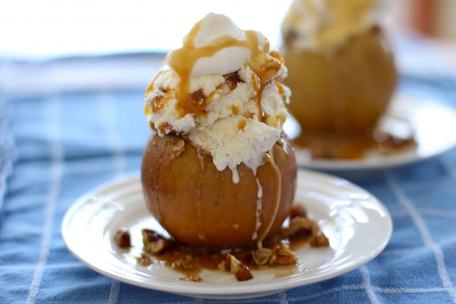 Готові яблука викладаємо на блюдо, кожне від душі поливаємо вершками, викладаємо залишки начинки і посипаємо горіхами. Подаємо разом з кавою.