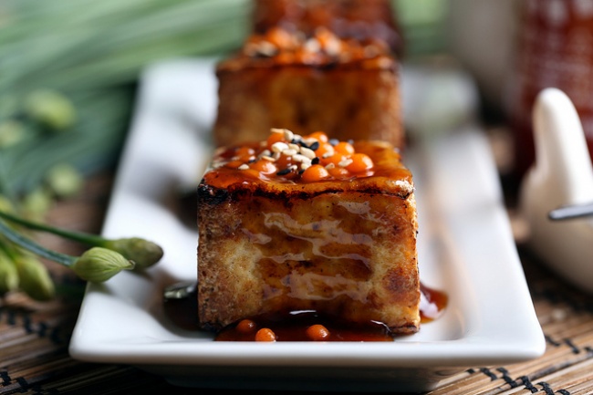Ще один більш складний рецепт для тих, хто відчув любов до високої кухні. Якщо ви не знайдете потрібний для перлин соус шрірача, можна прикрасити тофу желейної ікрою або готової посипкою для прикраси тортів.