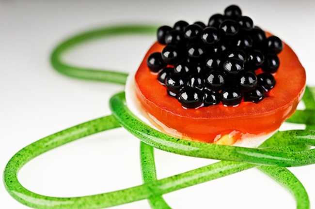 Набираємо суміш в шприц без голки. Тримаємо шприц горизонтально над ємністю з охолодженим маслом і видавлюємо по краплі суміш в масло. Краплі не повинні потрапляти одна на іншу. На дні ємності ікринки будуть утворювати ідеальні сфери. Проціджуємо ікринки.