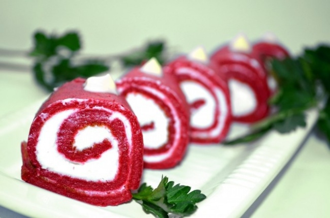 Злегка загустілий буряковий сік розливаємо тонким шаром на піднос з харчовою плівкою. Після того як желированный лист охолоне, наносимо на нього товстим шаром пряний м'який вершковий сир і скачуємо в рол. Розрізаємо одержаний рол гострим ножем.