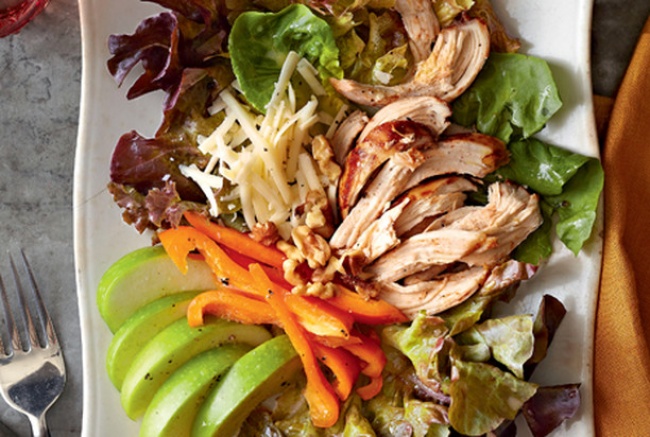 - Додати в чашу з заправкою шматочки салату, перемішати. Розкласти на порційні тарілки, зверху викласти шматочки філе, перець і яблука, посипати горіхами і тертим сиром.