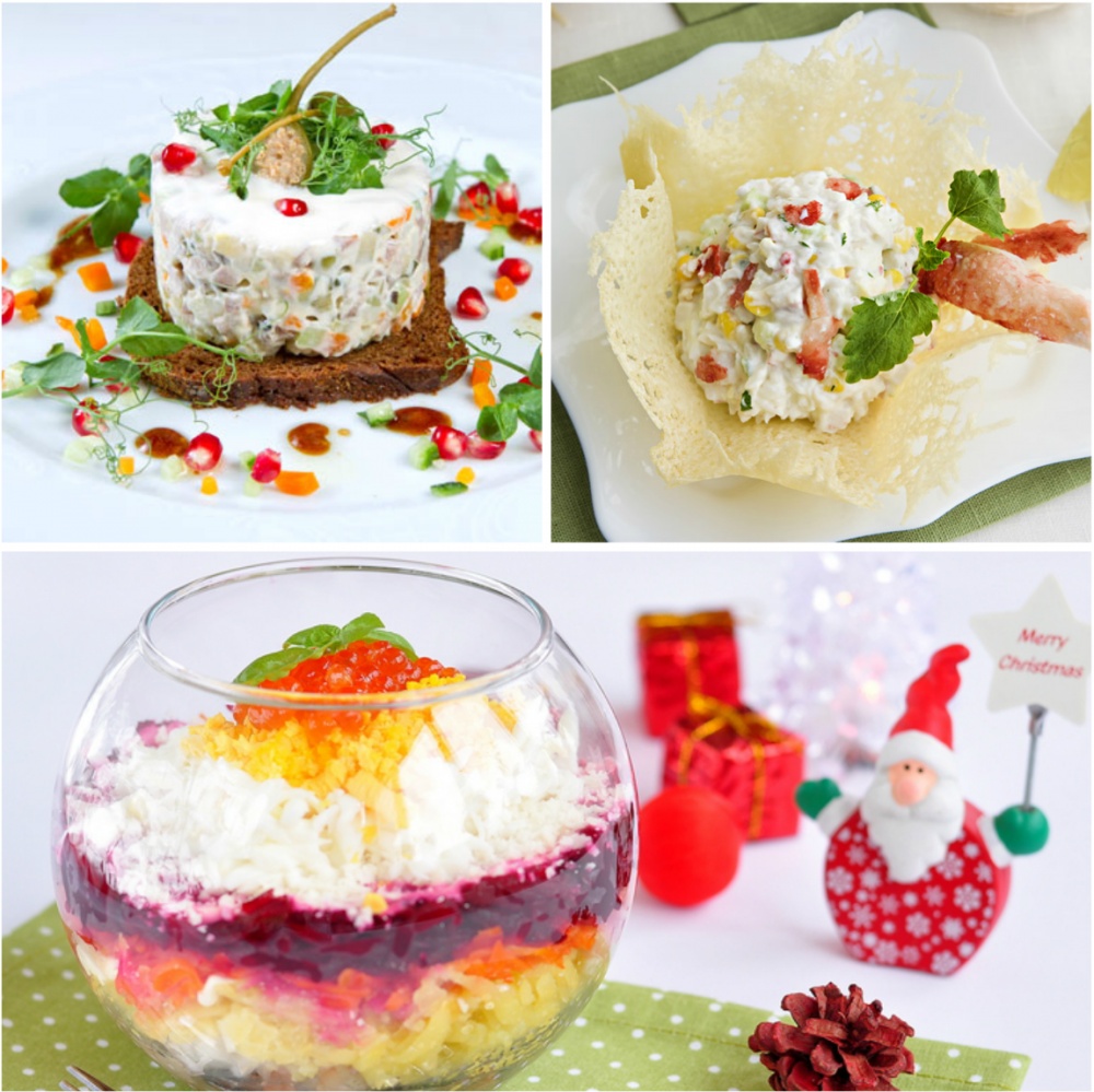 Олів'є, крабовий салат в сирній кошику і оселедець під шубою