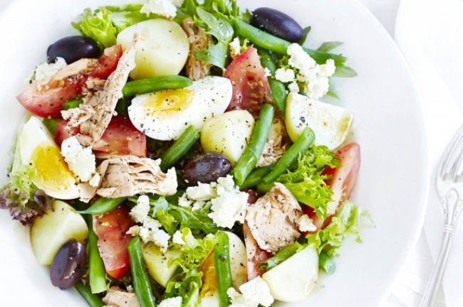 - З'єднайте салат, квасолю, картоплю і помідори, заправити половиною заправки, перемішайте. Викладіть на блюдо, покладіть зверху шматочки курки, маслини, половинки яєць. Полийте залишилася заправкою.